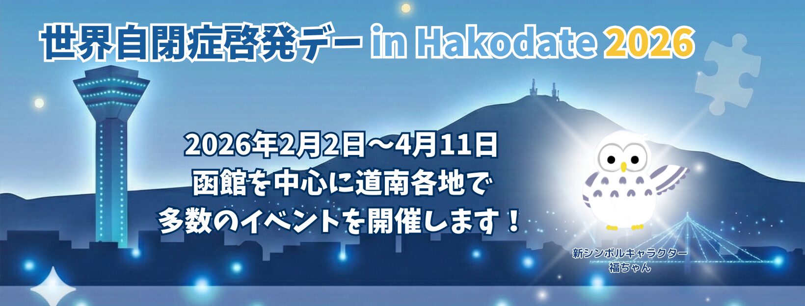毎年4月2日は国連が定めた世界自閉症啓発デーです。この日には、世界中のランドマークがシンボルカラーのブルーにライトアップされ、様々なイベントを通じて世界中の人々が自閉症について知り、考え、話し合っています。函館地域でも2013年から実行委員会を組織してイベントを開始。五稜郭タワーのブルーライトアップをはじめとして、幅広い方々に自閉症について関心をもっていただくためのイベントを開催しています。シンボルキャラクターは10年にわたって活躍してきた「北うさぎ」から「福ちゃん」へバトンタッチ。どちらも誰もが暮らしやすい地域を目指す、この地域の心優しい人々の代表です。