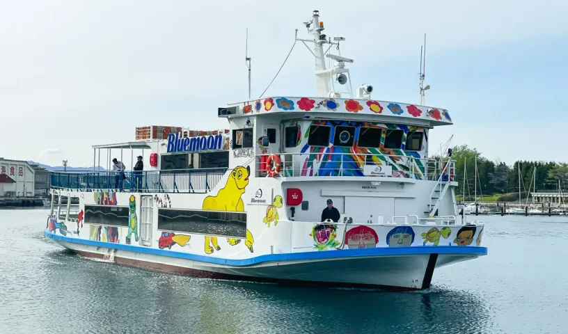 まるかつ水産は、障がいのある方々が制作したアート作品を多数購入し、店内に展示してくださっているほか、所有する函館湾遊覧船「ブルームーン」の船体ラッピングにも障害者アートを採用するなど、アール・ブリュットの普及・推進に積極的に取り組まれている企業です。